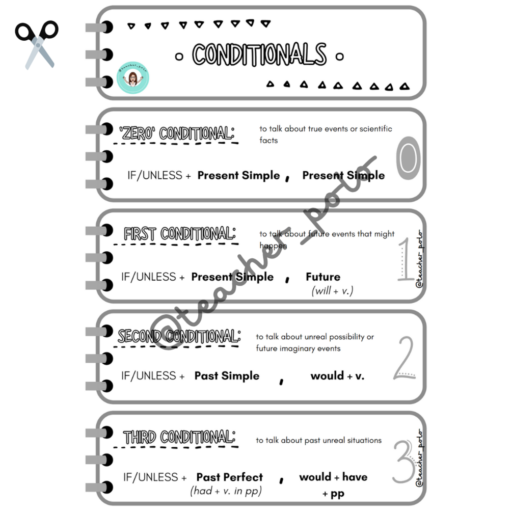 Poster resumen de los tipos de condicionales de inglés para colgar en clase. Incluye además un minibook para que los estudiantes puedan crear su propio material decorándolo y convirtiéndolo en su propio material de repaso y estudio de los Conditionals 😊😊😊